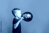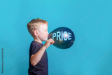 Cute boy blond European in a black t-shirt on a blue background in the Studio. A surprised beautiful funny Child inflates and bursts a balloon with the inscription price on black Friday.