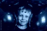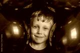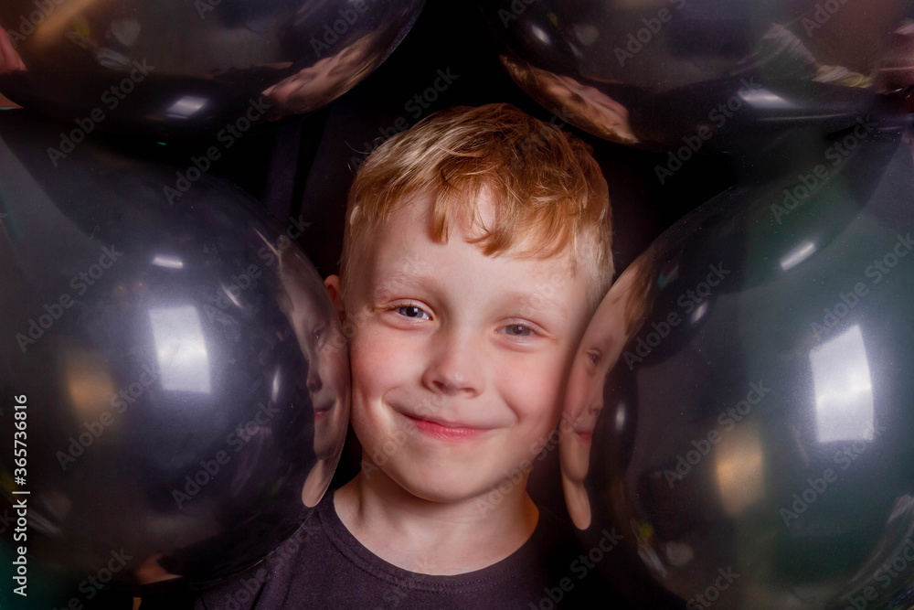 Cute funny Baby boy European is surrounded by black balloons. Face close-up.