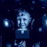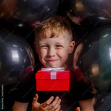 Cute funny Baby boy European is surrounded by black balloons. Face close-up. The boy holds a red box with a gift under his chin. Background of balloons.