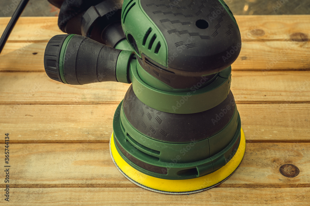Machine for cleaning wooden surfaces.Handmade work.Wood processing. Sanding the old surface.