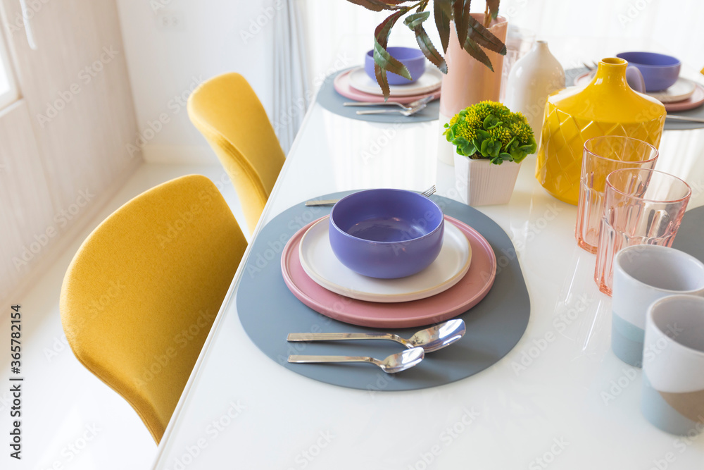 Beautiful table setting with pink and purple plate on table. Glassware and cutlery for catered event dinner.