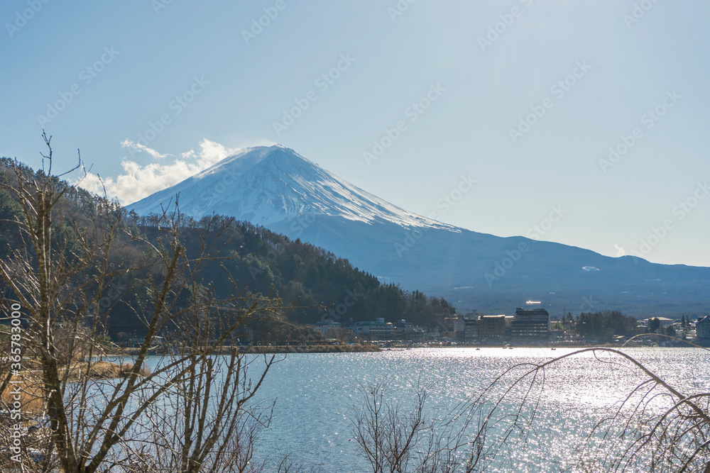Mount Fuji view from Lake Kawaguchi, Yamanashi Prefecture, Japan.
