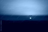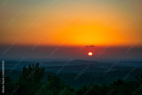 beautiful landscape colorful sunset over the mountains valley with orange round sun close to the horizon with clear sky with only one small cloud