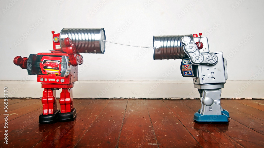retro robots on tin can phones