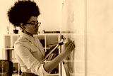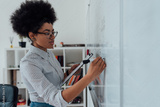 Distance education. Close up of a young afro american female teacher writing on a whiteboard while teaching English language online, working from home