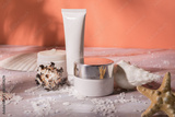 Sea Salt Skin Care Cosmetics. Dead sea natural cream on a marble background.