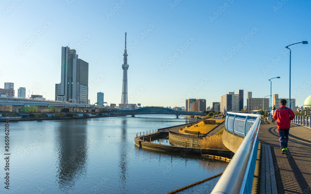 Tokyo Skytree with blue sky background and Sumida river as foreground in Tokyo, Japan