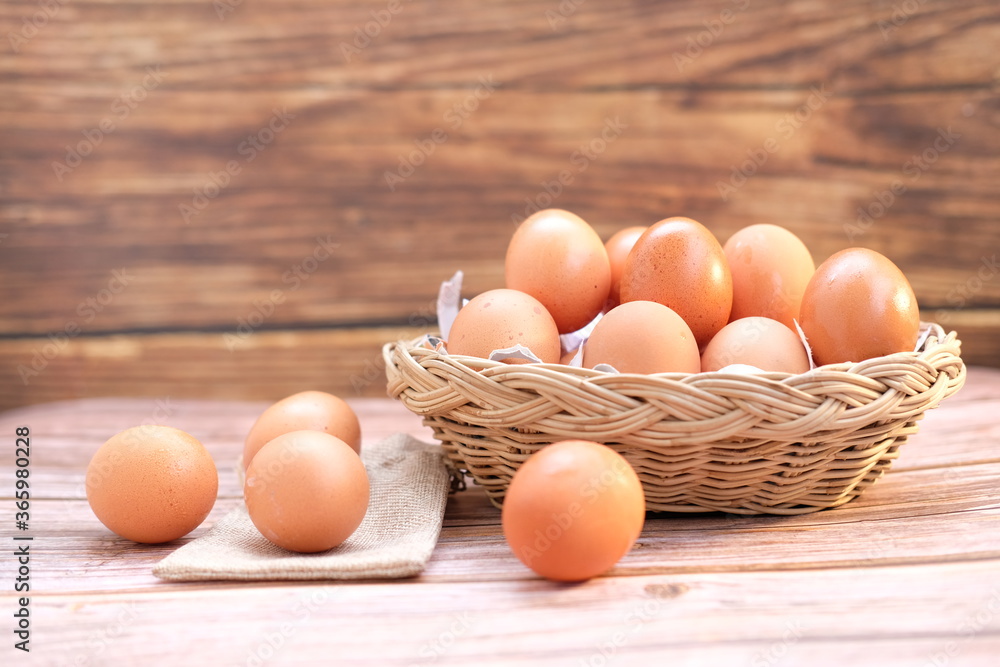 Eggs on wooden table background and space for text