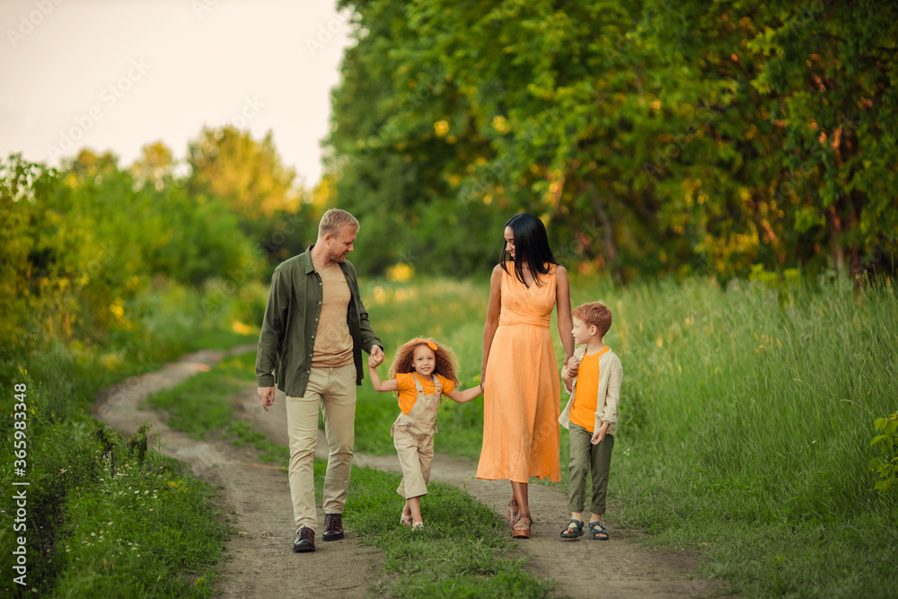 Happy international family on a summer walk in the park.