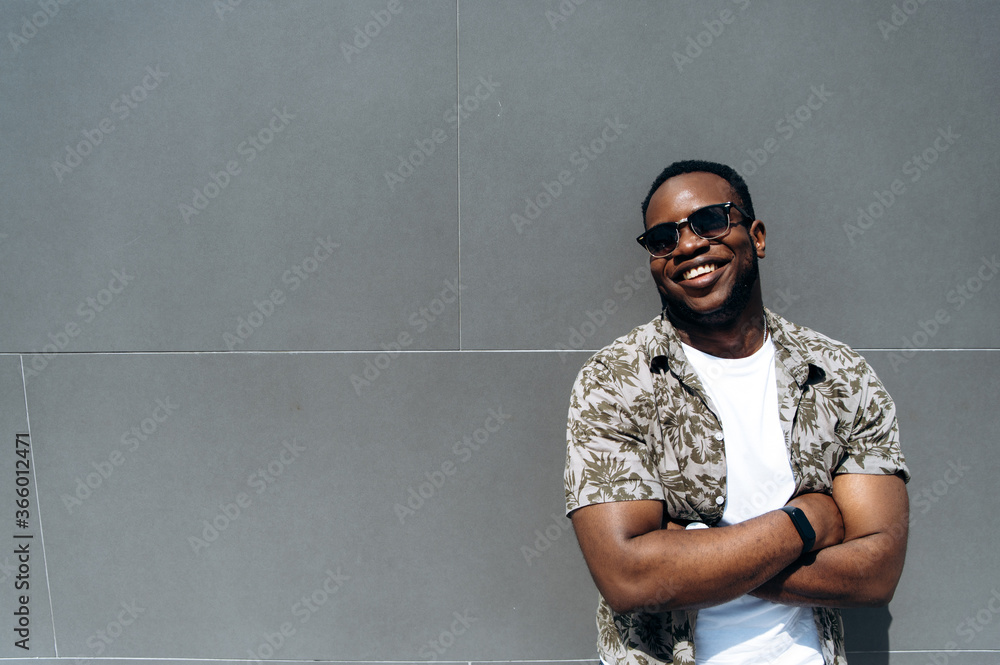 Confident young afro-american stylish guy in sunglasses posing standing near a wall outdoors and smiling