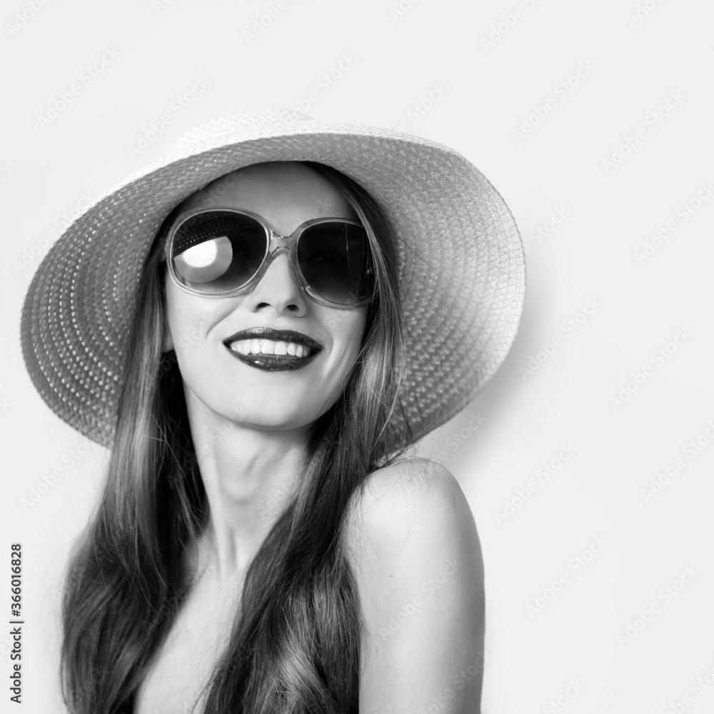 Beautiful woman wearing hat and sunglasses happy smiling, black and white