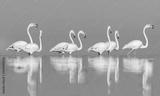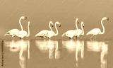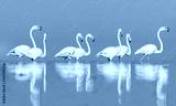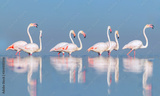 Wild african birds. Group birds of pink african flamingos walking around the blue lagoon on a sunny day.