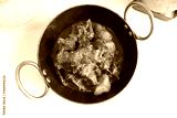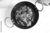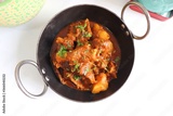 Mutton curry. Mutton Vindaloo gravy or mutton masala is a famous Spicy nonvegetarian dish of India. Its made out of Goat meat along with spices. Garnished with fresh coriander. copy space.