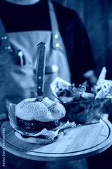close-up of a waiter using face mask serving a delicious meat burger with fries