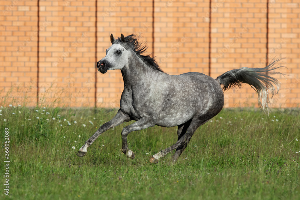 Beautiful gray arabian horse runs on natural summer background, fullbody portrait in motion closeup