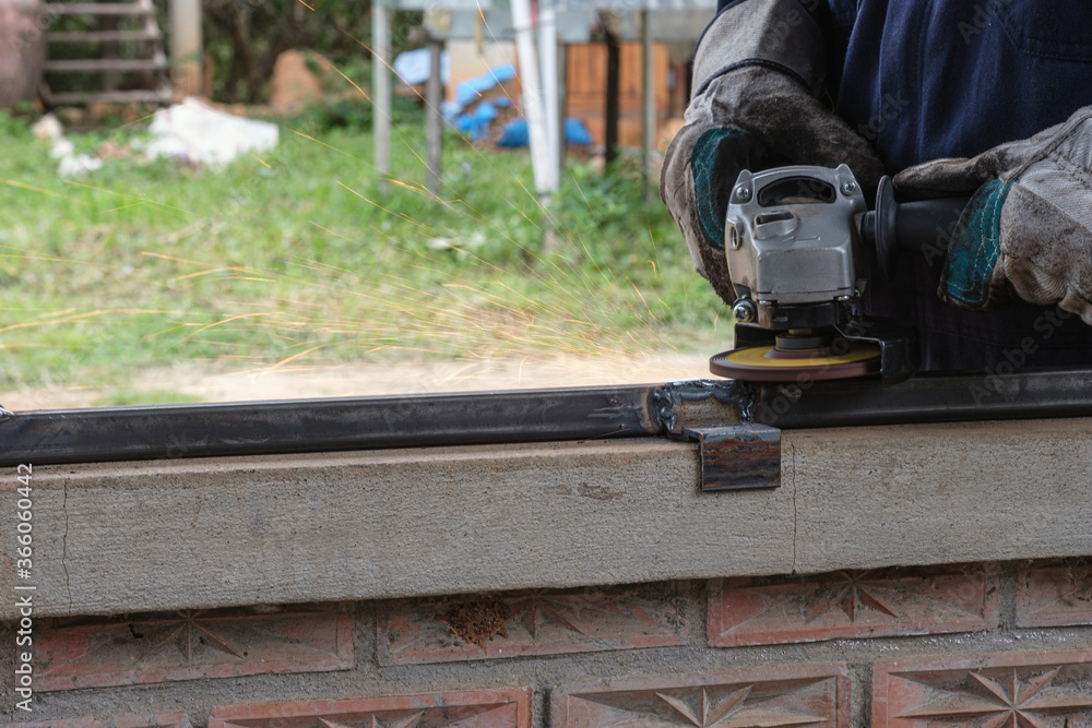 Men who are using grinding tools on steel of window