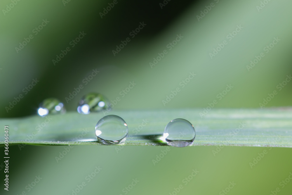 Dew drops on green grass leaf close up. meadow grass in drops rain, nature background. From pure water