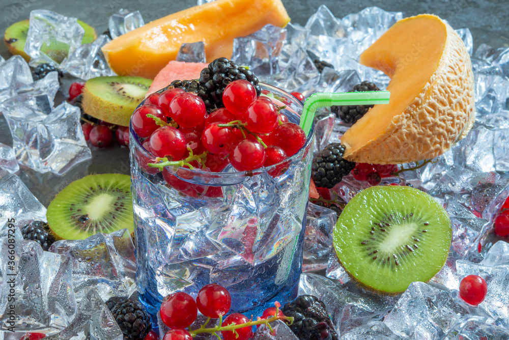 thirst quenching glass with cold water and fresh summer fruit with ice