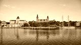 Retro toned panoramic picture of Waly Chrobrego (Hakenterrasse) with Provincial Office building and National Museum in Szczecin at sunrise, Poland.