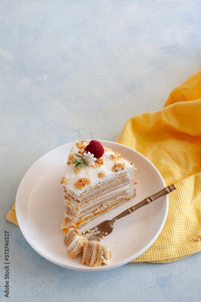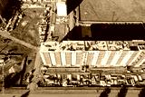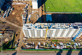 Construction site of a residential building. Construction cranes work along the building on crane tracks, and construction materials are stored around the building. The view from the top.