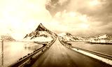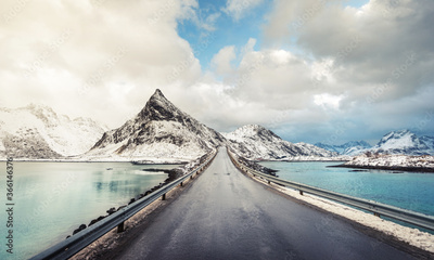 Olstind Mount and asphalt road. Lofoten islands, spring time, Norway