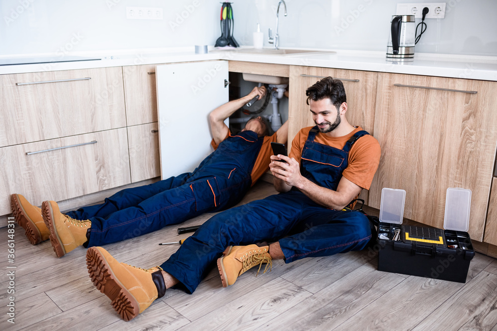 Young repairman, worker in uniform sitting on the floor, using smartphone while his experienced colleague fixing sink pipe indoors. Repair service, new generation concept
