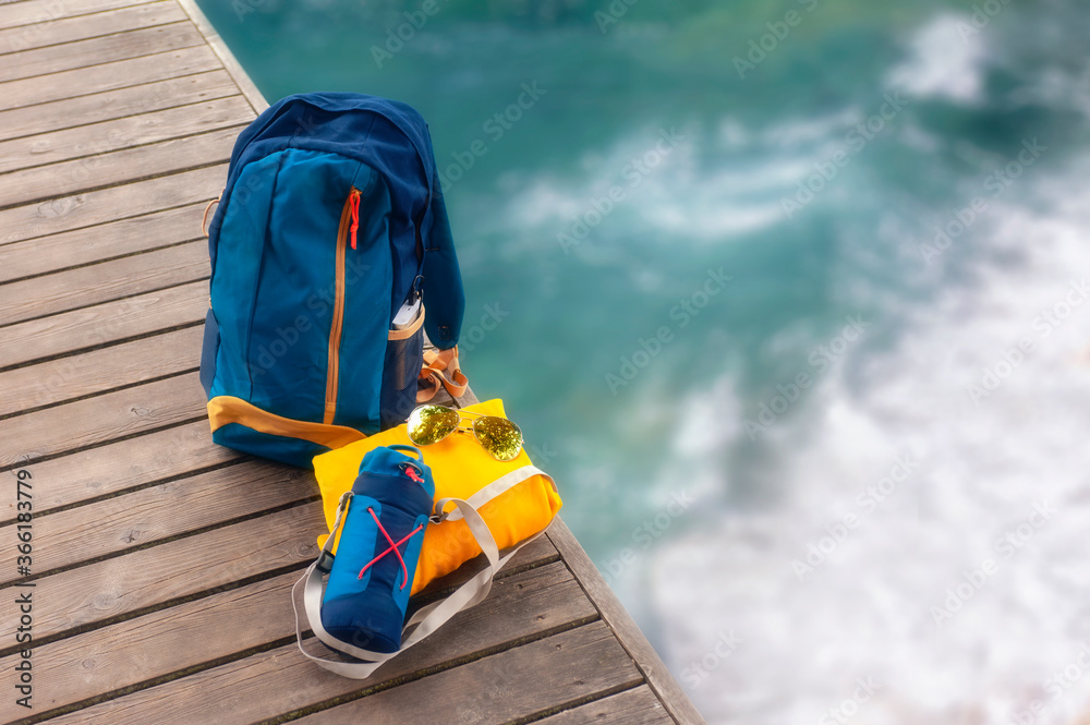 Portable travel charger. Power Bank charges a musical speaker against a backdrop of journey bags, a beach and sky with cloud. Concept on the theme of tourism.