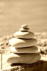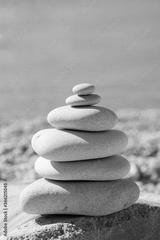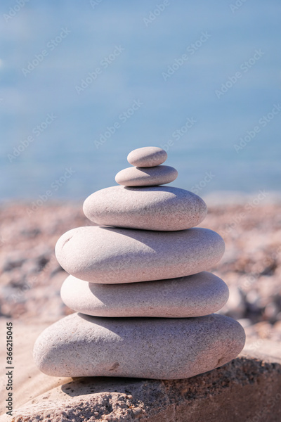 Symbol Scales is made of stones of various shapes. Balance of stones. Balancing stones on the shore. Tourism, travel.