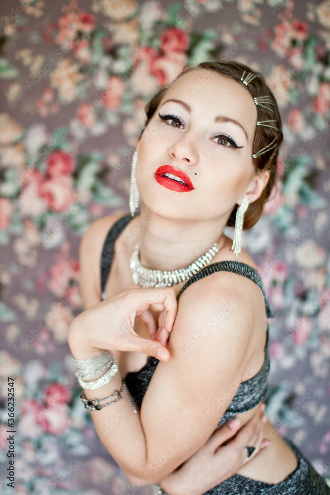 Elegant retro woman wearing beautiful accessories over floral background
