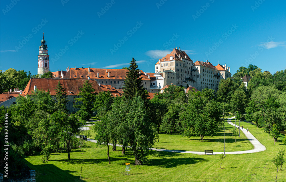 Cesky Krumlov. Castle, Tower, cityscape, sunny summer day.Czech republic