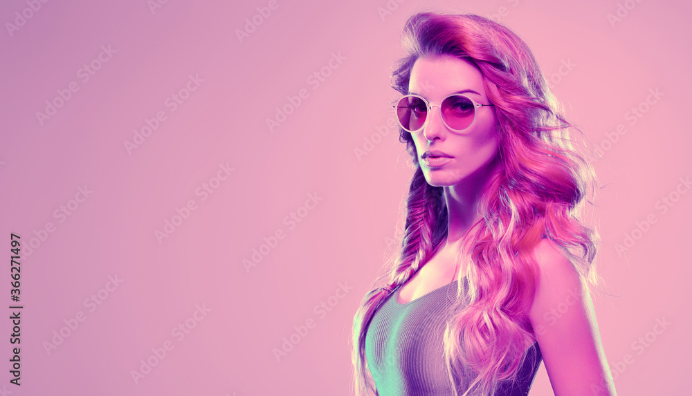 High Fashion. Woman in colorful neon light, make-up. Sexy girl, stylish hair, trendy makeup. Party disco pink purple neon style. Creative art beauty portrait, fashionable model face, make up