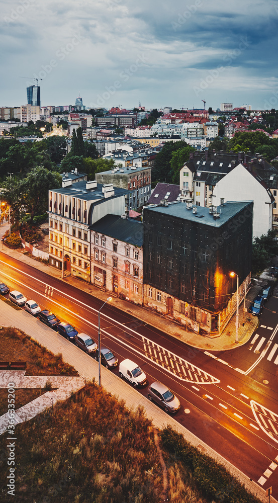 Aerial view of Niebuszewo district in Szczecin City at dusk, color toning applied, Poland.