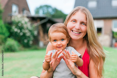 Happy young mother and baby in garden