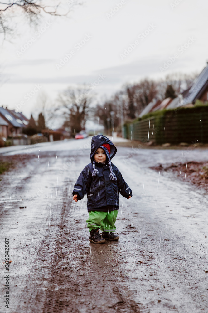 Toddler girl on footpath with raindrops