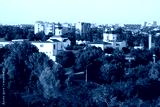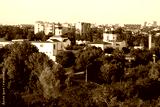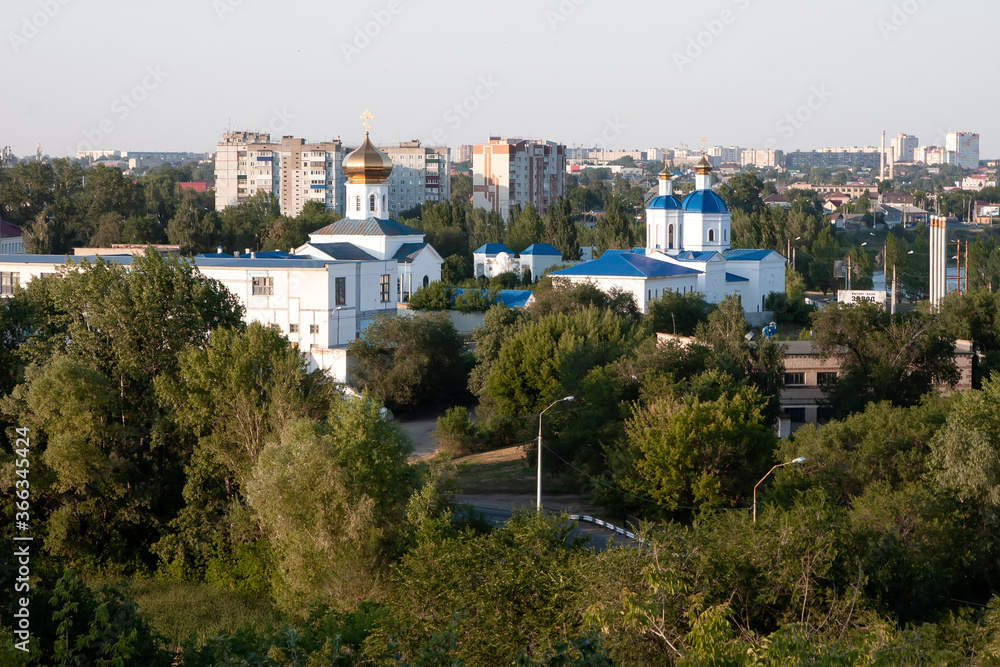 Cityscape with churches behind green trees