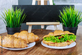 Fresh croissants with pork chicken tomatoes cucumbers salad on a white plate on a wooden table. Black Copy space.