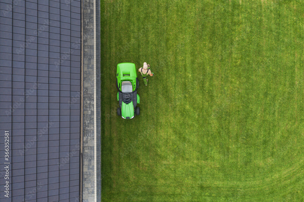 Aerial View of Riding Lawn Mower and Caucasian Gardener.