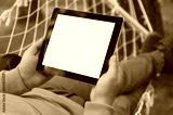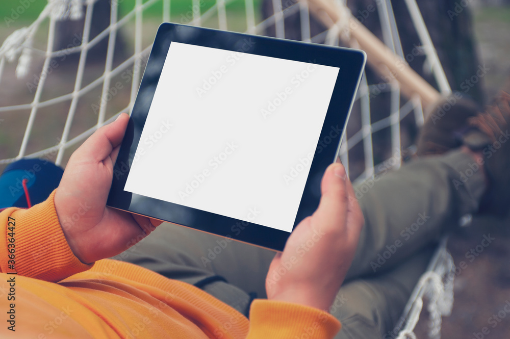 Man lies and rests in a hammock with a mock-up of a tablet with a white screen in his hands.