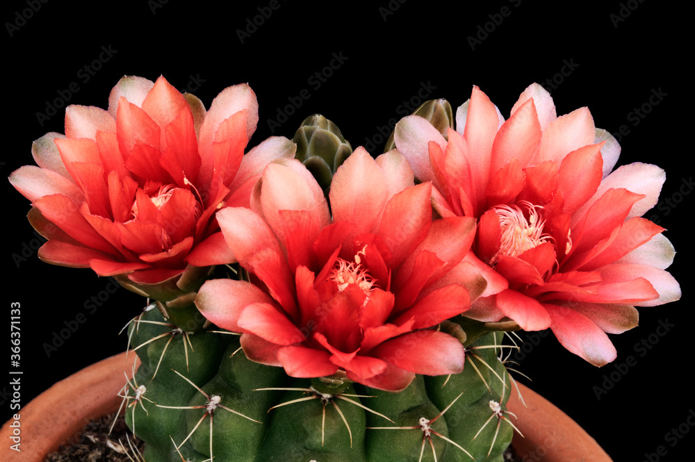 Beautiful cactus flowers against a black background. The cactus is Gymnocalycium baldianum known as spider cactus or dwarf chin cactus.