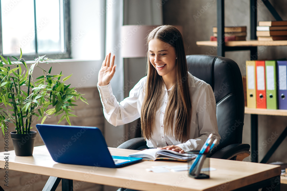 Video call. Video conference with classmates or employees. Caucasian cheerful girl communicates via video call, she is waving hello into camera and smiles happily. Stay home