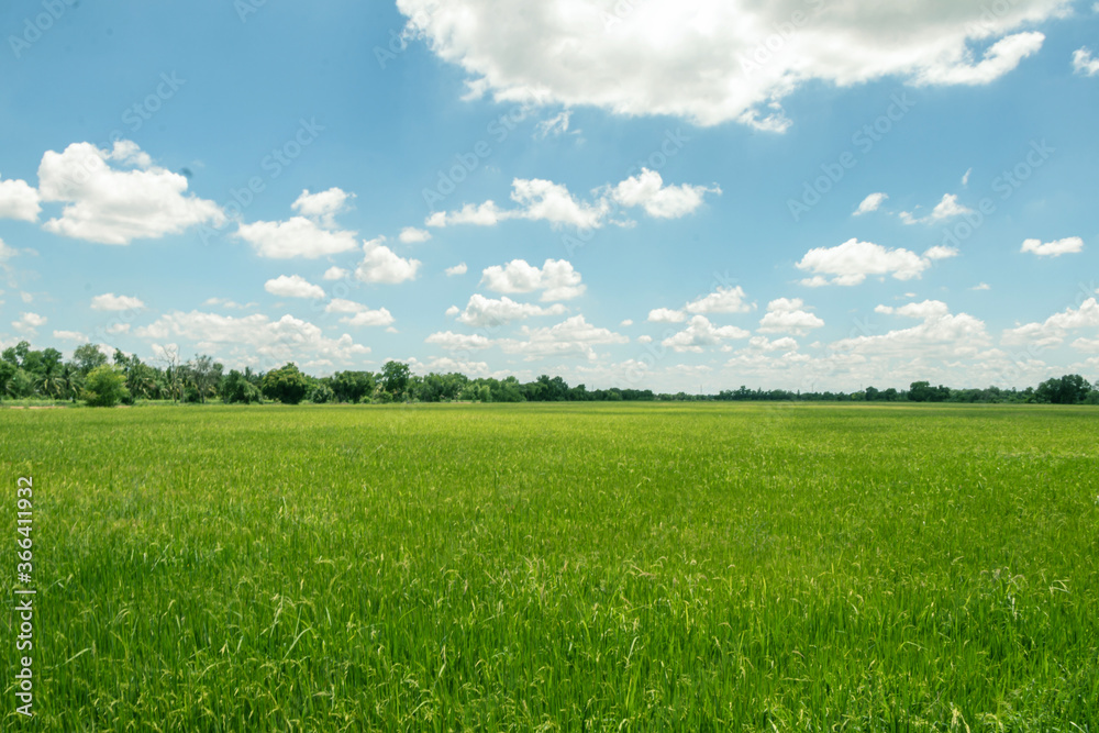 Rice fields,green tree and blue sky.Beautiful green field wallpaper.
