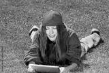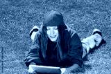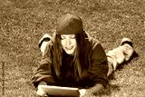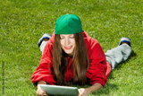 young woman lying on the grass wearing color youth clothes reading a book on tablet