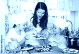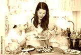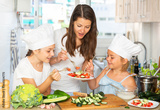 Portrait of happy family of mother and two daughters eating freshly cooked salad at home kitchen