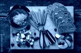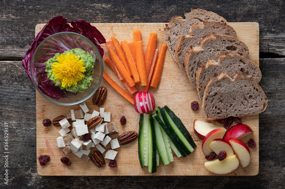 Top view of delicious vegan appetizer served on wooden board