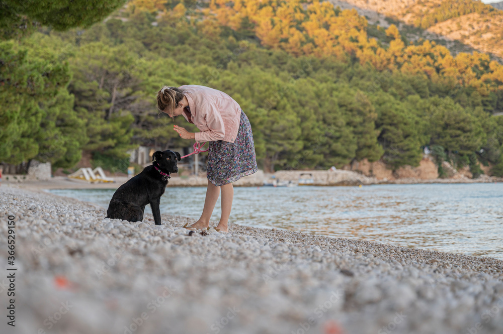 Woman training her black shepherd dog using a halti leash giving it a gesture command