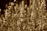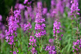 Bright Magenta thickets of blooming fireweed (Epilobium angustifolium) on forest background.