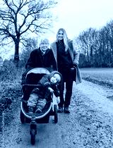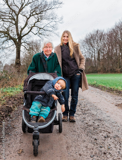95 years old great grandmother with granddaughter and great granddaughter on footpath