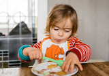 Toddler girl sitting on table and eating with spoon