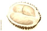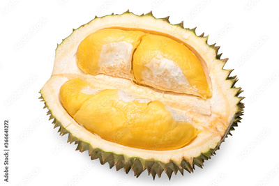 A fresh durian (Puangmanee Durian) is the king of fruits on white background,durian fruit with delicious golden yellow soft flesh,durian isolated on white background
