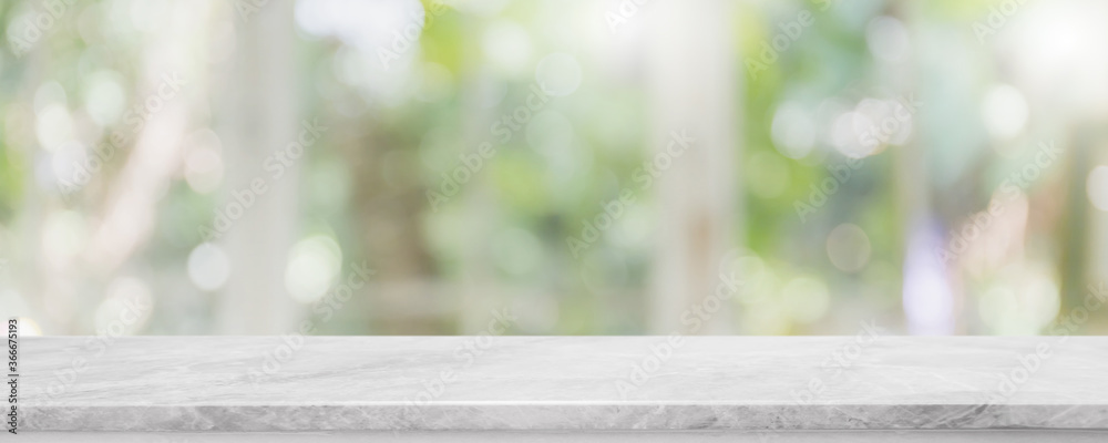 Empty white stone marble table top and blurred of interior restaurant with window view green from tree garden background background - can used for display or montage your products.